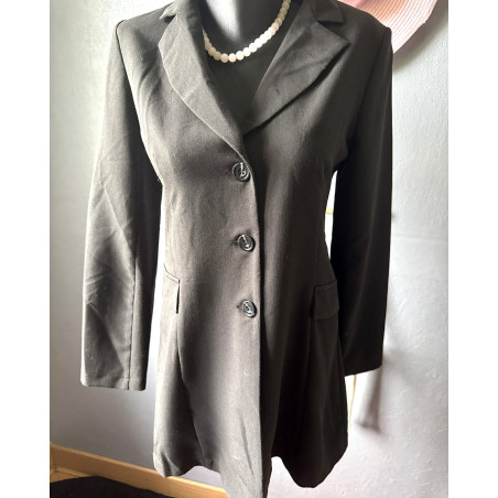 Blazer noir long coupe cintrée signé Pourquoi Pas Paris, une pièce vintage élégante et intemporelle facile à intégrer dans un dressing minimaliste. Sa coupe structurée souligne la silhouette tandis que sa longueur apporte une allure moderne et sophistiquée.
