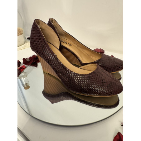 Très jolies compensées Liberto couleur bordeaux / prune effet python, modèle féminin et facile à porter au quotidien comme pour une tenue habillée.